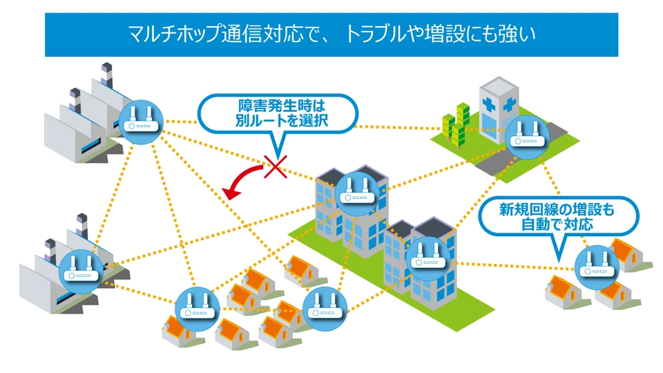 一般的な認知度はまだ低いものの、Wi-Fi®やBluetooth®に比べ、「長距離通信」「低消費電力」「障害物に強い」「マルチホップ通信対応」といった特長を持ち、スマート社会の発展への貢献が期待されています。